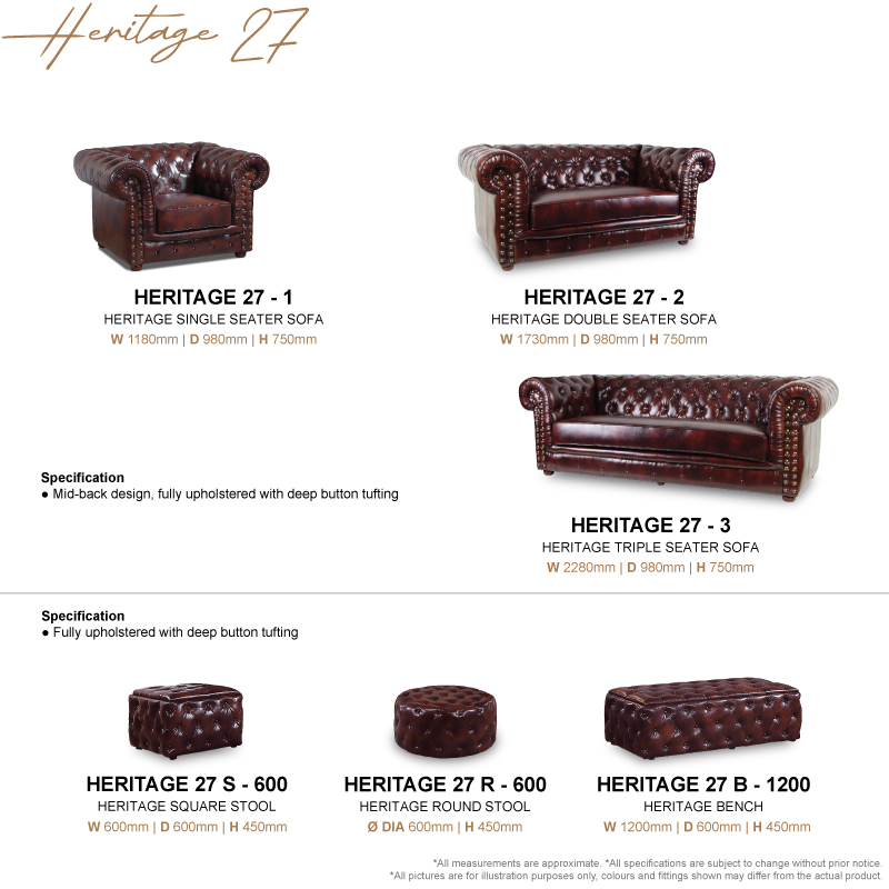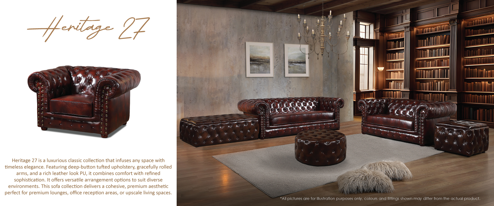 HERITAGE 27 Collection, a luxurious and timeless furniture set that exudes elegance and sophistication. This premium collection features exquisite, tufted seating, designed to elevate any room with its classic appeal and superior craftsmanship.