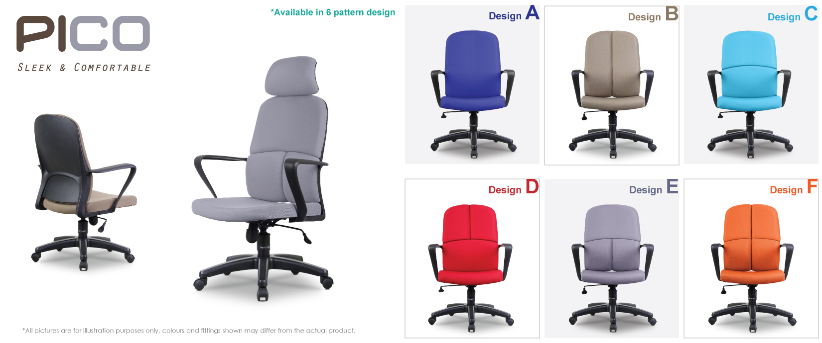 PICO designs and builds innovative, ergonomic office chairs that are result of long hours of sitting. It comes with 6 pattern design.